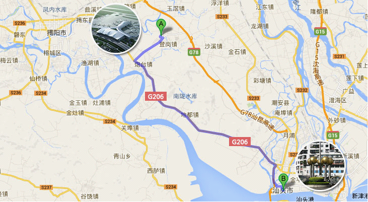 路線1:汕頭市區(qū)-G206國道-揭陽潮汕機(jī)場(chǎng)進(jìn)場(chǎng)路-揭陽潮汕機(jī)場(chǎng)