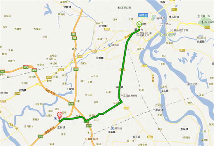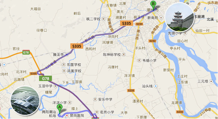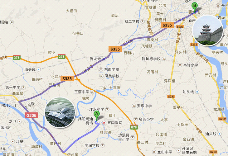 路線1:潮州市區(qū)-S335線-登崗互通出高速G78-揭陽潮汕機(jī)場(chǎng)進(jìn)場(chǎng)路-揭陽潮汕機(jī)場(chǎng)