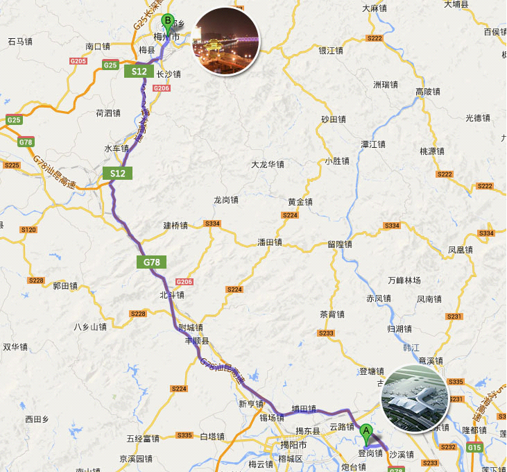 梅州市區(qū)-梅龍高速S12-登崗互通出高速-揭陽潮汕機(jī)場(chǎng)進(jìn)場(chǎng)路-揭陽潮汕機(jī)場(chǎng)